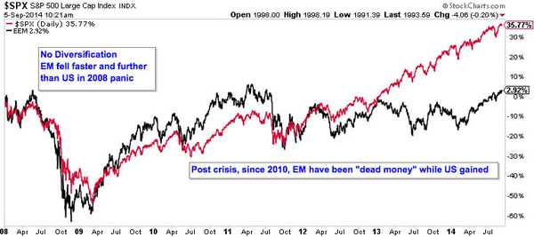 Things changed in 2008. As investors painfully learned in 1998, sudden changes in the value of the U.S. dollar can collapse fragile emerging economies. Remember the 1997-98 Asian Tigers' crisis and the collapse of Russia? As the next chart shows, history repeated itself in 2008 when emerging markets provided no diversification. Post crisis, since 2010, emerging markets have failed to return to their early 2000s glory. They have been largely ‘dead money' while U.S. and other developed markets advanced. This trend accelerated in 2013, a year in which the dollar and Euro currencies dramatically strengthened; causing pain for emerging market investors. (see chart below)