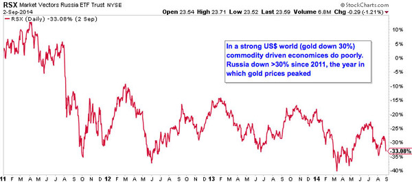 One notable country that has experience the pain of a stronger US dollar is Russia. Russia's stock market has fallen roughly 40% since 2011, the year in which gold prices peaked at $1,900/oz. Converseley, the U.S. stock market is up 65% over the same time period. The Russian stock market's dismal performance is a symptom of economic distress that is not a surprise in a strong dollar world. (see chart below)