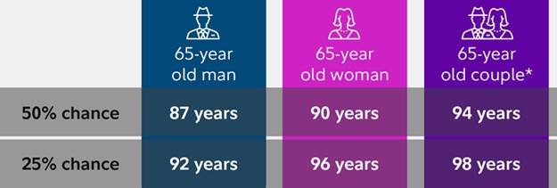 According to Laura Carstensen, director of the Stanford Center on Longevity, life expectancy increases about 3 months with each year that passes. Today, there is a 50% chance at least one half of a 65-year old couple will live to the age of 94. Pretty amazing, considering the average life expectancy in 1900 was 47 years!