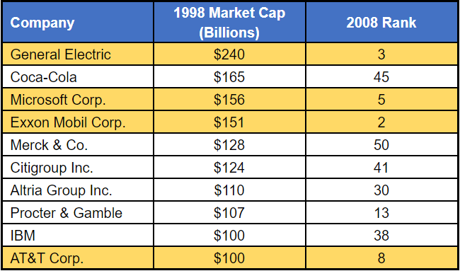 Here are the top ten largest stocks on U.S. exchanges as of 1/1/1998, along with their respective rankings ten years later. Those who remained in the top ten are highlighted.