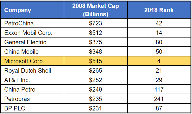 Here are the ten biggest firms trading on U.S. exchanges as of 1/1/2008, and their respective rankings ten years later. Microsoft is the sole survivor.