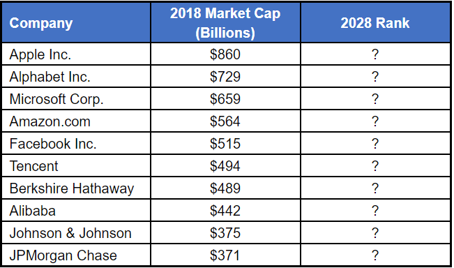 Now, here is the top ten at the beginning of this year. Where will these companies rank in ten years? If history is any guide, some will remain on the list, but most will fall off.
